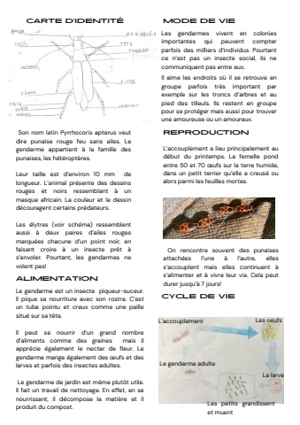 Son nom latin Pyrrhocoris apterus veutdire punaise rouge feu sans ailes. Legendarme appartient %u00e0 la famille despunaises, les h%u00e9t%u00e9ropt%u00e8res. Leur taille est d%u2019environ 10 mm delongueur. L%u2019animal pr%u00e9sente des dessinsrouges et noirs ressemblant %u00e0 unmasque africain. La couleur et le dessind%u00e9couragent certains pr%u00e9dateurs. Les %u00e9lytres (voir sch%u00e9ma) ressemblentaussi %u00e0 deux paires d%u2019ailes rougesmarqu%u00e9es chacune d%u2019un point noir, enfaisant croire %u00e0 un insecte pr%u00eat %u00e0s%u2019envoler. Pourtant, les gendarmes nevolent pas!Le gendarme est un insecte piqueur-suceur.Il pique sa nourriture avec son rostre. C%u2019estun tube pointu et creux comme une paillesitu%u00e9 sur sa t%u00eate. Il peut se nourrir d%u2019un grand nombred%u2019aliments comme des graines mais ilappr%u00e9cie %u00e9galement le nectar de fleur. Legendarme mange %u00e9galement des %u0153ufs et deslarves et parfois des insectes adultes. Le gendarme de jardin est m%u00eame plut%u00f4t utile.Il fait un travail de nettoyage. En effet, en senourrissant, il d%u00e9compose la mati%u00e8re et ilproduit du compost. Les gendarmes vivent en coloniesimportantes qui peuvent compterparfois des milliers d%u2019individus. Pourtantce n%u2019est pas un insecte social, ils necommuniquent pas entre eux.L%u2019accouplement a lieu principalement aud%u00e9but du printemps. La femelle pondentre 50 et 70 %u0153ufs sur la terre humide,dans un petit terrier qu%u2019elle a creus%u00e9 oualors parmi les feuilles mortes. Il aime les endroits o%u00f9 il se retrouve engroupe parfois tr%u00e8s important parexemple sur les troncs d%u2019arbres et aupied des tilleuls. Ils restent en groupepour se prot%u00e9ger mais aussi pour trouverune amoureuse ou un amoureux. CARTE D%u2019IDENTIT%u00c9ALIMENTATION REPRODUCTION CYCLE DE VIE MODE DE VIE On rencontre souvent des punaisesattach%u00e9es l%u2019une %u00e0 l%u2019autre, elless%u2019accouplent mais elles continuent %u00e0s%u2019alimenter et %u00e0 vivre leur vie. Cela peutdurer jusqu%u2019%u00e0 7 jours!L%u2019accouplement Les oeufsLa larveLes petits grandissentet muentLe gendarme adulte
