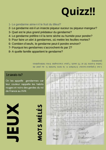 JEUXQuizz!!On les appelle gendarmes carleur couleur rappelle les habitsrouges et noirs des gardes du roide France au XVIII. Le savais-tu?1- Le gendarme aime-t-il le fruit du tilleul?2- Le gendarme est-il un insecte piqueur-suceur ou piqueur-mangeur?3- Quel est le plus grand pr%u00e9dateur du gendarme?4- Le gendarme pr%u00e9f%u00e8re-t-il la terre s%u00e8che ou humide pour pondre?5- Pour faire un abri %u00e0 gendarmes, o%u00f9 mettre les feuilles mortes?6- Combien d%u2019oeufs, le gendarme peut-il pondre environ?7- Pourquoi les gendarmes s%u2019accrochent-ils par 2?8- A quelle famille appartient le gendarme? de 1-oui 2-piqueur-suceur 3-l%u2018enfant 4- la terre humide 5- au piedpt%u00e8res l%u2018arbre 6-entre 50 et 70 oeufs 7-pour s%u2018accoupler 8-les h%u00e9t%u00e9ro(punaises)MOTS M%u00c9L%u00c9S