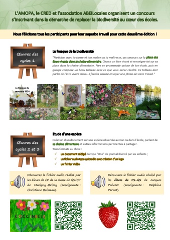 L%u2019AMOPA, le CRED et l%u2019association ABEILocales organisent un concours s%u2019inscrivant dans la d%u00e9marche de replacer la biodiversit%u00e9 au c%u0153ur des %u00e9coles. Nous f%u00e9licitons tous les participants pour leur superbe travail pour cette deuxi%u00e8me %u00e9dition ! La fresque de la biodiversit%u00e9 \%u00eatres vivants dans la chaine alimentaire. Choisis un %u00eatre vivant et renseigne-toi sur sa place dans la chaine alimentaire. Pars en promenade autour de ton %u00e9cole, puis en groupe compose un beau tableau avec ce que vous aurez r%u00e9colt%u00e9. Ce tableau doit parler de l%u2019%u00eatre vivant choisi. Il faudra ensuite envoyer une photo de votre travail.\Etude d%u2019une esp%u00e8ce Cr%u00e9ation d%u2019un document sur une esp%u00e8ce observ%u00e9e autour ou dans l%u2019%u00e9cole, parlant de sa chaine alimentaire et autres informations pertinentes %u00e0 partager. Trois formats au choix : %uf0fc un document r%u00e9dig%u00e9 du type \%uf0fc un fichier audio type webradio avec cr%u00e9ation d%u2019un logo%uf0fc un fichier vid%u00e9o. %u0152uvres des cycles 1 %u0152uvres des cycles 2 et 3 D%u00e9couvrez le fichier audio r%u00e9alis%u00e9 par les %u00e9l%u00e8ves de CP de la classe de GS/CP de Marigny-Brizay (enseignante : Christiane Boisseau).D%u00e9couvrez le fichier audio r%u00e9alis%u00e9 par les %u00e9l%u00e8ves de PS-GS de Jacques Pr%u00e9vert (enseignante : Delphine Perrot).