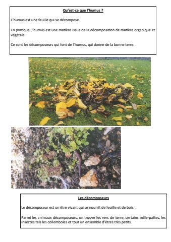 Qu%u2019est-ce que l%u2019humus ? L%u2019humus est une feuille qui se d%u00e9compose. En pratique, l%u2019humus est une mati%u00e8re issue de la d%u00e9composition de mati%u00e8re organique et v%u00e9g%u00e9tale. Ce sont les d%u00e9composeurs qui font de l%u2019humus, qui donne de la bonne terre. Les d%u00e9composeurs Le d%u00e9composeur est un %u00eatre vivant qui se nourrit de feuille et de bois. Parmi les animaux d%u00e9composeurs, on trouve les vers de terre, certains mille-pattes, les insectes tels les collemboles et tout un ensemble d%u2019%u00eatres tr%u00e8s petits.